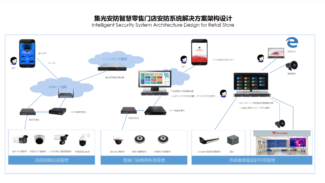 leyu.樂魚安防雙光智能警戒系統(tǒng) 支持門店部署,攝像機部署于門店出入口, 除可滿足門店視頻監(jiān)控功能外,當顧客進店時,該系統(tǒng)可第一時間通過前沿人形檢測視頻分析技術(shù)識別顧客進店狀態(tài),按后臺預設歡迎語播報歡迎語音進行提醒,便于店員及時提供接待服務,提升門店新老顧客進店的體驗及滿意度,系統(tǒng)支持leyu.樂魚安防G-Cloud集云移動客戶端遠程視頻管理、報警郵件推送。